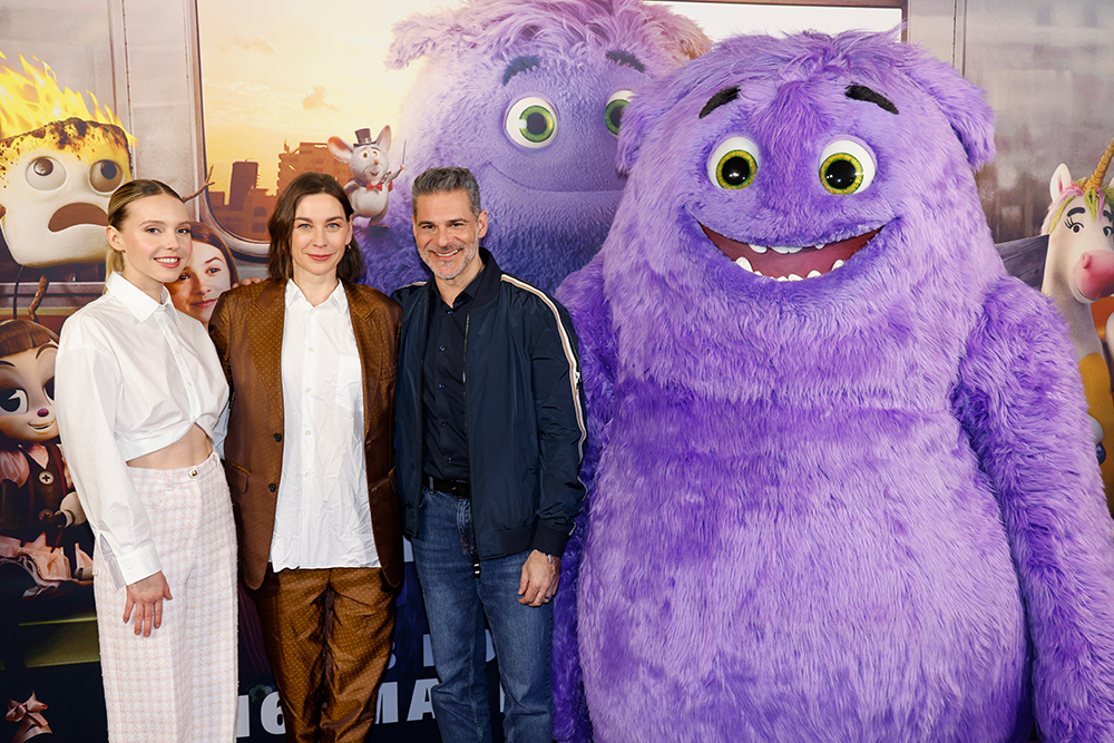 Die prominenten Synchronsprecher*innen Rick Kavanian, der dem liebenswerten lila Flausch-Giganten Blue seine Stimme leiht, Christiane Paul, die die elegante Schmetterlingsdame Blossom spricht, und Lina Larissa Strahl alias Eini, das fröhliche Einhorn, wurden von Moderator Malte Arkona willkommen geheißen und begrüßten das bestens gelaunte Publikum in Berlin.
