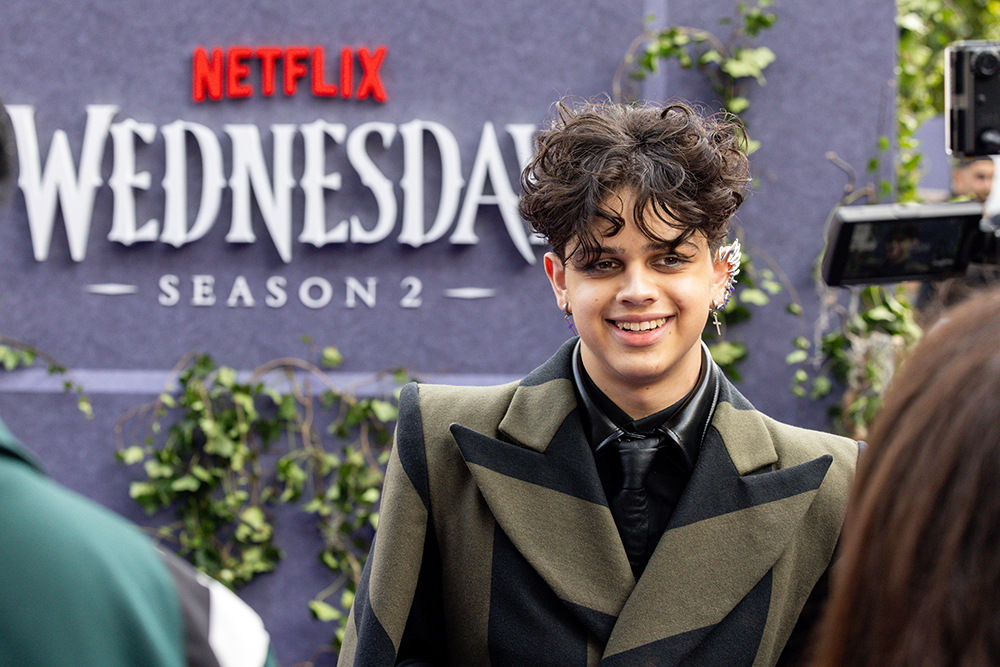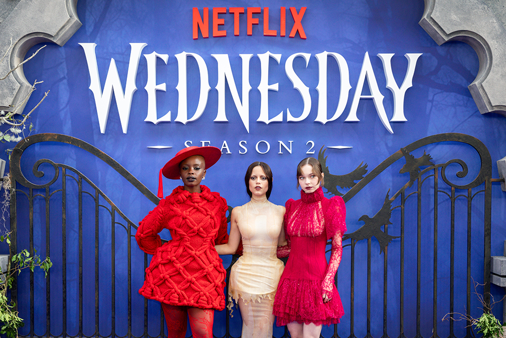 Über den lilafarbenen Teppich wandelten die Stars und Kreativen der Serie, flankiert von einer detailverliebten Szenerie, die die Welt von Wednesday zum Leben erweckte.