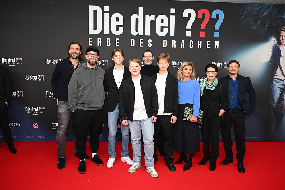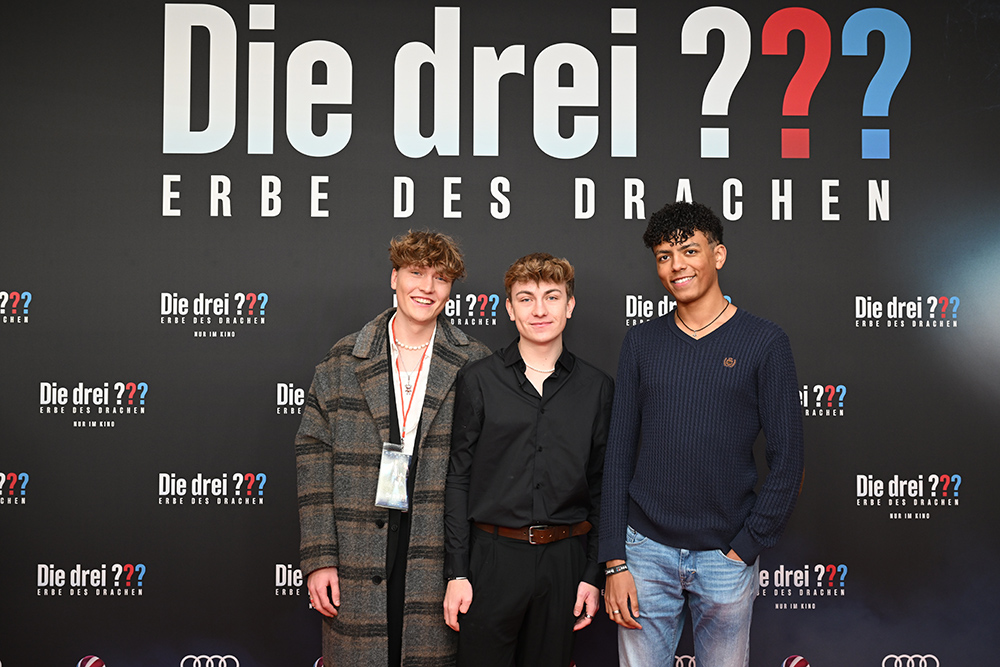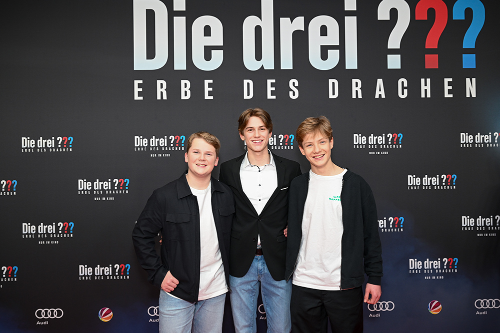 Seit Jahrzehnten begeistert das berühmteste Detektiv-Trio der Welt Groß und Klein und so war es auch bei der Weltpremiere des neuen Kinofilms DIE DREI ??? – ERBE DES DRACHEN am 15. Januar 2023 in München. Die Hauptdarsteller Julius Weckauf, Nevio Wendt und Levi Brandl wurden – passend zu den Signature-Farben der Drei ??? – in weißen, roten und blauen Audis vorgefahren. Zusammen mit Florian Lukas, Gudrun Landgrebe, Regisseur Tim Dünschede, Produzentin Justyna Muesch, Produzent Max Wiedemann sowie Mark Forster, Sänger des Abspannsongs „Memories & Stories“, versammelten sie sich auf dem roten Teppich.