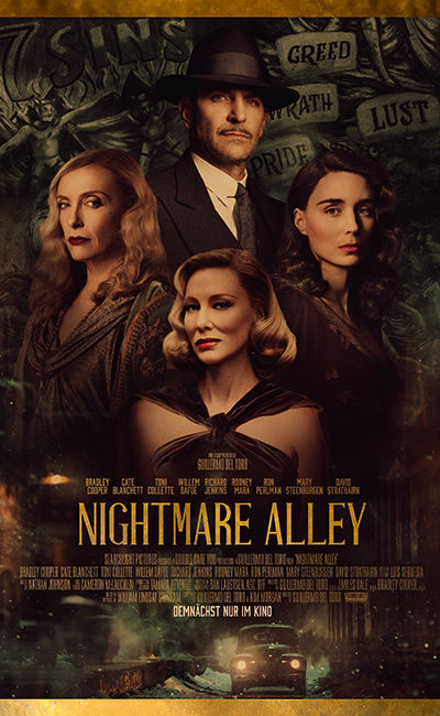 Für sein schillerndes Meisterwerk ist es dem zweifachen Oscar®-Preisträger und Regisseur Guillermo del Toro („The Shape of Water: Das Flüstern des Wassers“, „Pans Labyrinth“) gelungen eine glänzende Starbesetzung vor der Kamera zu versammeln. Bradley Cooper („A Star is Born“, „American Hustle“), Oscar®-Preisträgerin Cate Blanchett („The Aviator“, „Blue Jasmine“), Toni Collette („Knives Out: Mord ist Familiensache“, „Madame - Nicht die feine Art“), Rooney Mara („Carol“, „Her“) brillieren in dieser dunklen Geschichte um Täuschung, Selbsttäuschung und dem Traum von Erlösung. In weiteren Rollen des hochkarätigen Ensembles glänzen Willem Dafoe („The French Dispatch“, „Der Leuchturm“), Richard Jenkins („Shape of Water: Das Flüstern des Wassers, „Kajillionaire“), Ron Perlman („Hellboy“,„Phantastische Tierwesen und wo sie zu finden“), Mary Steenburgen („Book Club - Das Beste kommt noch“, „Picknick mit Bären“), David Strathairn („Nomadland“, „Godzilla“).