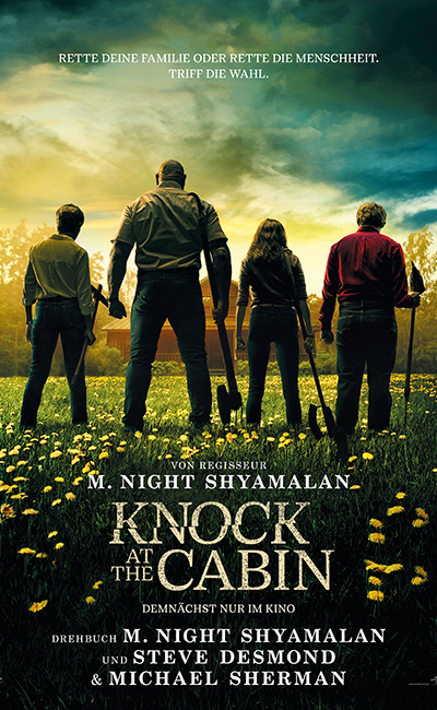 Universal Pictures präsentiert mit M. Night Shyamalans KNOCK AT THE CABIN eine Produktion von Blinding Edge Pictures in Zusammenarbeit mit FilmNation Features und Wishmore Entertainment. Das Drehbuch stammt von M. Night Shyamalan und Steve Desmond & Michael Sherman und basiert auf dem Bestseller „The Cabin at the End of the World“ von Paul Tremblay. Der Film wird von M. Night Shyamalan inszeniert und von M. Night Shyamalan, Marc Bienstock (Split, Glass) und Ashwin Rajan (Servant, Glass) produziert. Die ausführenden Produzenten sind Steven Schneider, Christos V. Konstantakopoulos und Ashley Fox.