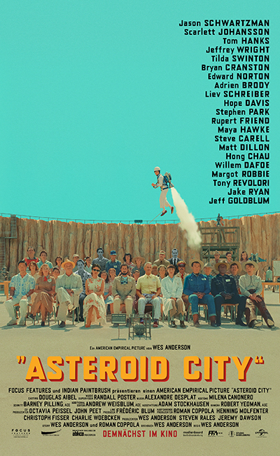 Universal Pictures präsentiert mit ASTEROID CITY den neuesten Film von Kult-Regisseur Wes Anderson (Grand Budapest Hotel, The French Dispatch, Die Royal Tenenbaums). Der All-Star-Cast liest sich wie ein Who’s who Hollywoods mit Jason Schwartzman, Scarlett Johansson, Tom Hanks, Jeffrey Wright, Tilda Swinton, Bryan Cranston, Edward Norton, Adrien Brody, Liev Schreiber, Hope Davis, Stephen Park, Rupert Friend, Maya Hawke, Steve Carell, Matt Dillon, Hong Chau, Willem Dafoe, Margot Robbie, Tony Revolori, Jake Ryan und Jeff Goldblum. Das Drehbuch für den in spektakulären Pastelltönen gehaltenen Film stammt von Anderson, basierend auf einer Idee, die er zusammen mit Roman Coppola entwickelt hat. Der Film wird von Anderson, Steven Rales und Jeremy Dawson produziert.
