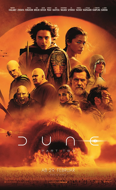 Das Leinwand-Epos setzt die Adaption von Frank Herberts gefeiertem Bestseller „Der Wüstenplanet“ fort. Zu sehen sind darin sowohl bereits aus dem ersten Teil bekannte als auch neue Stars, darunter Oscar-Kandidat Timothée Chalamet („Wonka“, „Call Me by Your Name“), Zendaya („Spider- Man: No Way Home“, „Malcolm & Marie“, „Euphoria“), Rebecca Ferguson („Mission: Impossible – Dead Reckoning“), die Oscar-Kandidaten Josh Brolin („Avengers: Endgame“, „Milk“) und Austin Butler („Elvis“, „Once Upon a Time in... Hollywood“), Oscar-Kandidatin Florence Pugh („Black Widow“, „Little Women“), Dave Bautista („Guardians of the Galaxy“-Filme, „Thor: Love and Thunder“), Oscar-Preisträger Christopher Walken („Die durch die Hölle gehen“, „Hairspray“), Léa Seydoux („James Bond“-Franchise, „Crimes of the Future“), Souheila Yacoub („The Braves”, „Climax”), Stellan Skarsgård („Mamma Mia!“- Filme, „Avengers: Age of Ultron“) sowie Oscar-Kandidatin Charlotte Rampling („45 Years“, „Assassin’s Creed“) und Oscar-Preisträger Javier Bardem („No Country for Old Men“, „Being the Ricardos“).