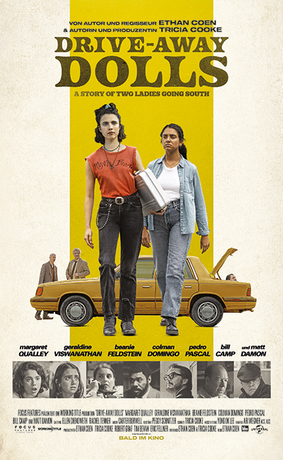 Darüber hinaus produzierten Coen und Cooke den Film gemeinsam mit Tim Bevan (Les Misérables), Eric Fellner (Yesterday) und Robert Graf (No Country for Old Men). Für das humorvolle Roadmovie DRIVE-AWAY DOLLS stellten Coen und sein Team ein hochkarätiges Schauspielensemble zusammen. Neben Margaret Qualley und Geraldine Viswanathan gehören unter anderem Beanie Feldstein (Booksmart), Colman Domingo (Candyman), Bill Camp (Jason Bourne) sowie Pedro Pascal (The Last of Us) und Oscar®-Preisträger Matt Damon (Good Will Hunting – Der gute Will Hunting, The Great Wall) zum Cast.