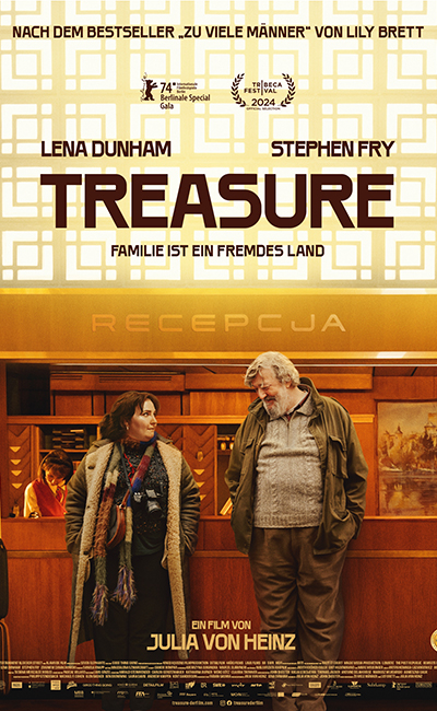 In den Hauptrollen brillieren die mit der Kult-Serie „Girls“ bekanntgewordene Lena Dunham sowie der gefeierte britische Ausnahmekünstler Stephen Fry („The Dropout“, OSCAR WILDE). Durch die Auseinandersetzung mit der erschütternden Vergangenheit ihrer Familie findet das charismatische Vater-Tochter-Duo im Laufe ihrer Reise wieder zueinander. Julia von Heinz inszeniert diese bewegende Familiengeschichte feinfühlig und mit warmem Humor. Nach seiner Weltpremiere im Rahmen der diesjährigen 74. Internationalen Filmfestspiele Berlin feierte TREASURE – FAMILIE IST EIN FREMDES LAND seine US-Premiere auf dem Tribeca Film Festival in New York.