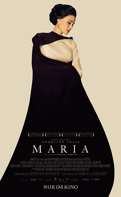 In MARIA zeichnet Regisseur Pablo Larraín („Spencer“, „Jackie“) nun ein bewegendes Leinwandporträt der Callas zwischen den Erinnerungen an ihre große Vergangenheit und dem unstillbaren Wunsch nach einem letzten Auftritt. Die Titelrolle spielt Oscar-Preisträgerin Angelina Jolie („Maleficent”, „Eternals”), die für ihre Darstellung schon bei der Weltpremiere im Wettbewerb von Venedig 2024 umjubelt wurde. Zur Besetzung gehören außerdem Pierfrancesco Favino („Adagio – Erbarmungslose Stadt”, „Der Kolibri - Chronik einer Liebe”), Alba Rohrwacher („Zwischen uns das Leben“, „La Chimera”), Haluk Bilginer (“Winterschlaf”), Kodi Smit-McPhee („The Power of the Dog“, „Elvis”) und Valeria Golino („The Morning Show“, „Porträt einer jungen Frau in Flammen”).