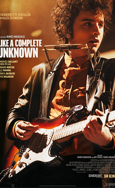 Searchlight Pictures präsentiert LIKE A COMPLETE UNKNOWN, den neuen Film des Oscar®-nominierten James Mangold („Walk the Line“, „Le Mans 66 – Gegen jede Chance“). Die Hauptrolle übernimmt der Oscar®-nominierte Timothée Chalamet („Call Me by Your Name“, „Dune“). An seiner Seite spielen der mehrfach Oscar®- und BAFTA-nominierte Edward Norton („Fight Club“, „Birdman oder (Die unverhoffte Macht der Ahnungslosigkeit)“), Elle Fanning („The Great“, „Maleficent – Die dunkle Fee“), Monica Barbaro („Top Gun: Maverick“), Boyd Holbrook („Logan: The Wolverine“, „The Bikeriders“), Dan Fogler („Phantastische Tierwesen und wo sie zu finden sind“, „The Walking Dead“) sowie Norbert Leo Butz („Dan in Real Life“) und Scoot McNairy („Argo“, „12 Years A Slave“).