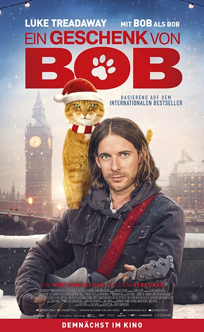 Bereits die Bestseller-Verfilmung BOB, DER STEUNER hat weltweit Millionen Menschen begeistert und berührt. Pünktlich zur Vorweihnachtszeit kommt EIN GESCHENK VON BOB am 26. November 2020 im Verleih von LEONINE in die Kinos. Eine herzerwärmende Geschichte mit dem berühmtesten Kater der Welt, wie sie nur das Leben schreiben kann.