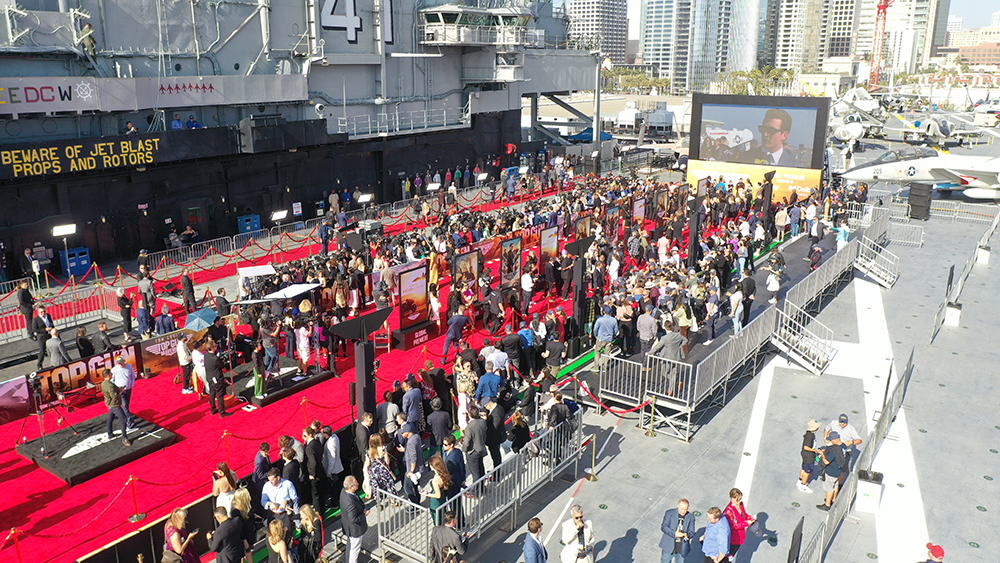 Auf dem legendären Flugzeugträger USS Midway, auf dem stilgerecht der rote Teppich lag, präsentierten sich Cast und Crew – allen voran Tom Cruise, Jennifer Connelly, Miles Teller, Regisseur Joseph Kosinski und Produzent Jerry Bruckheimer – gut gelaunt den zahlreichen Fans. Screening und Aftershow-Party fanden in stimmungsvoller Atmosphäre im Hafen von San Diego statt.